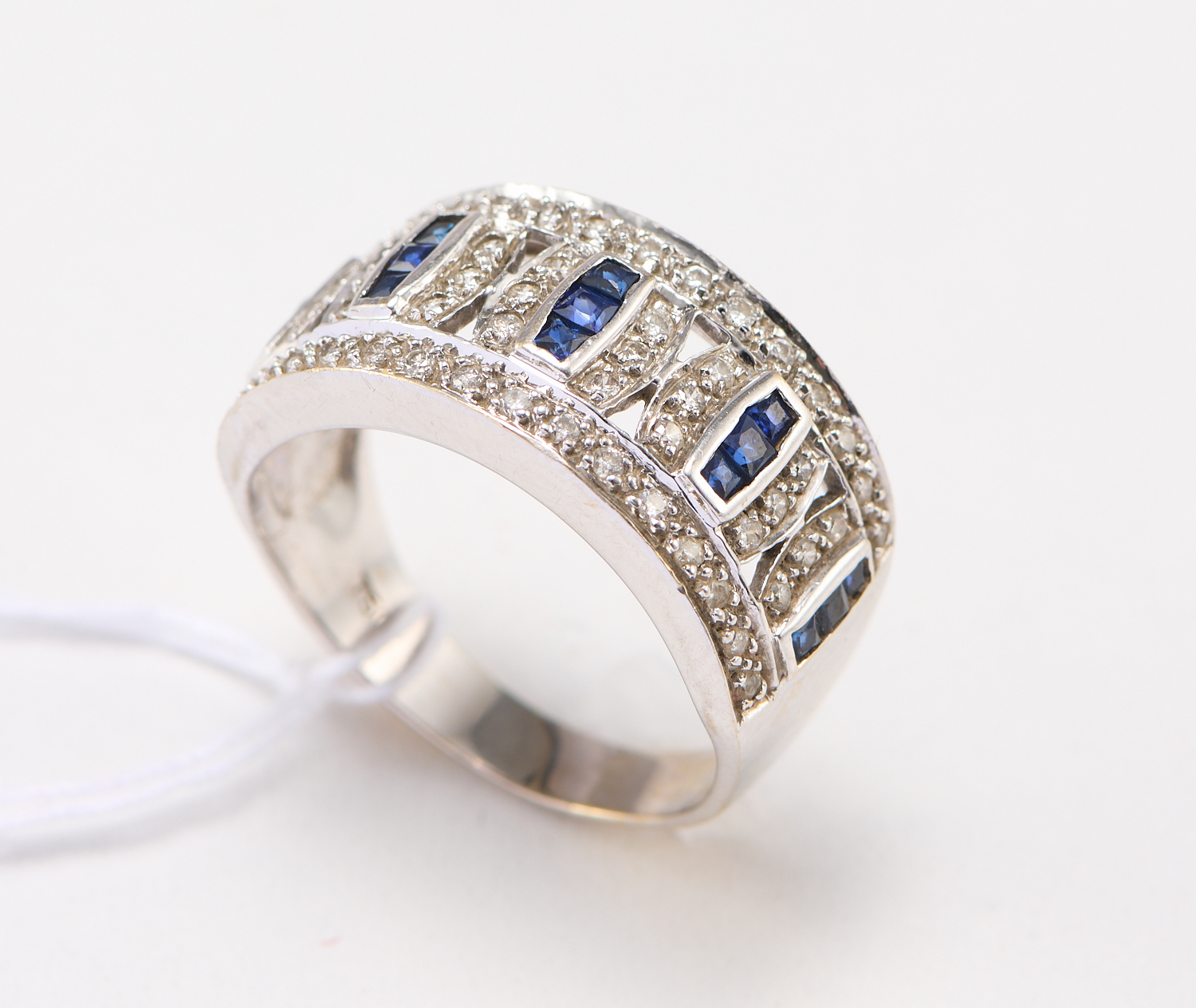 A SAPPHIRE AND DIAMOND RING IN 18CT WHITE GOLD, RING SIZE Q-R, 6.755GMS
