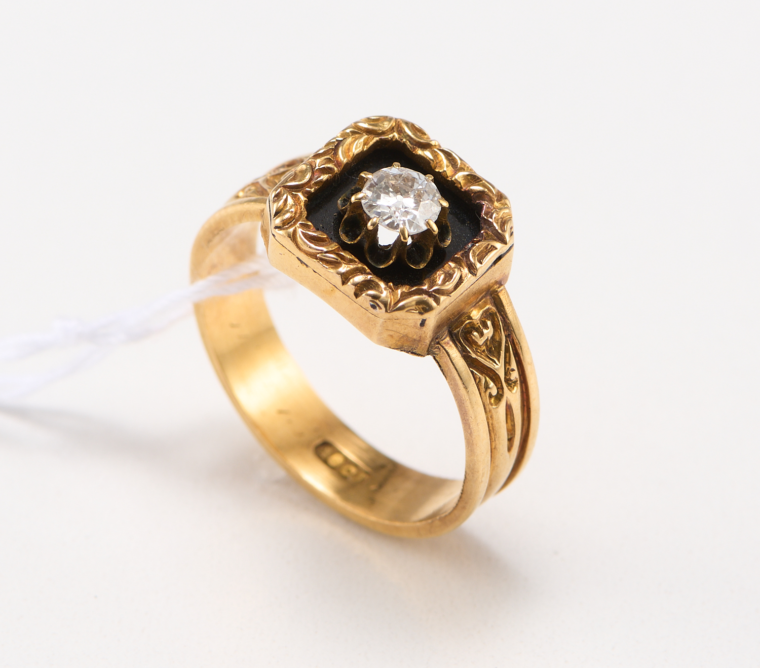 A DIAMOND AND ENAMEL VICTORIAN STYLE MOURNING RING IN 18CT GOLD, THE DIAMOND MEASURING APPROXIMATLEY 0.25CTS (MEASURED IN SETTING) RING SIZE O, 5.39GMS
