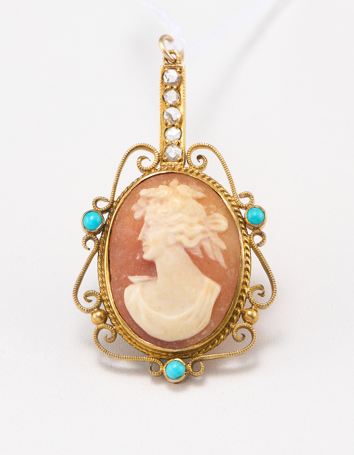 A VICTORIAN DIAMOND AND TURQUOISE CAMEO PENDANT IN 9CT GOLD, 40 X 25MM, 3.56GMS