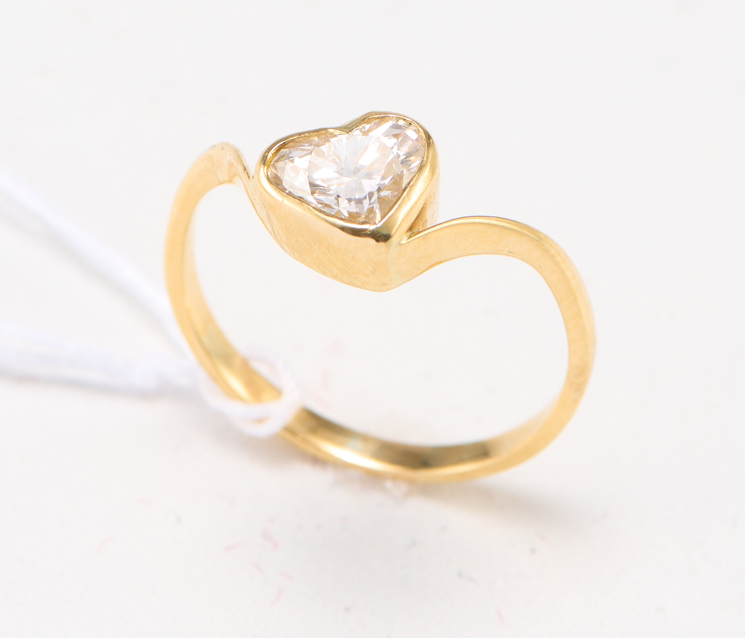 A HEART CUT SOLITAIRE DIAMOND RING IN 18CT GOLD, RING SIZE K, THE LAB GROWN DIAMOND TOTALLING 0.70CTS, 2.075GMS
