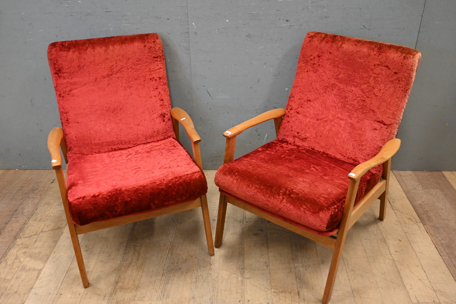 A PAIR OF 1950'S RED ARMCHAIRS (A/F) (82H X 62W X 75D CM) (LEONARD JOEL DELIVERY SIZE: X-LARGE)