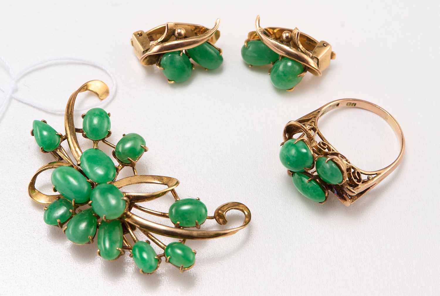 A JADE SET JEWELLERY SUITE IN 14CT GOLD COMPRISING OF A BROOCH (45MM X 30MM), A RING (SIZE L), AND EARRINGS TO CLIP ON FITTINGS (18MM X 12MM), TOTAL WEIGHT 21.3GMS