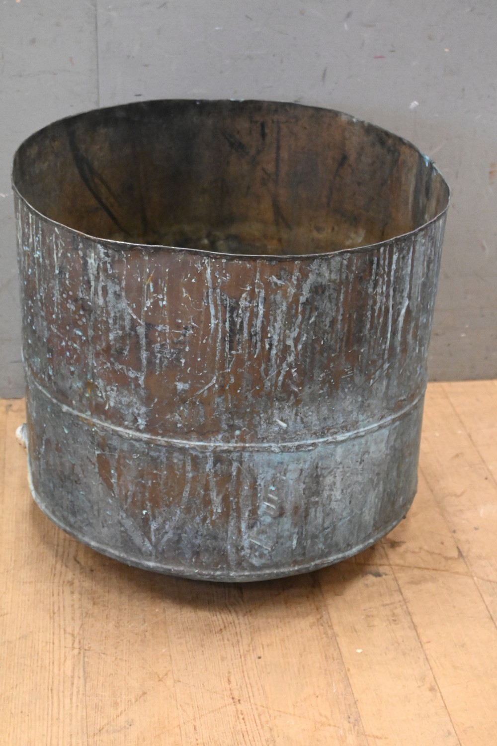 AN ANTIQUE COPPER TUB (A/F) (53H X 55D CM) (LEONARD JOEL DELIVERY SIZE: MEDIUM)