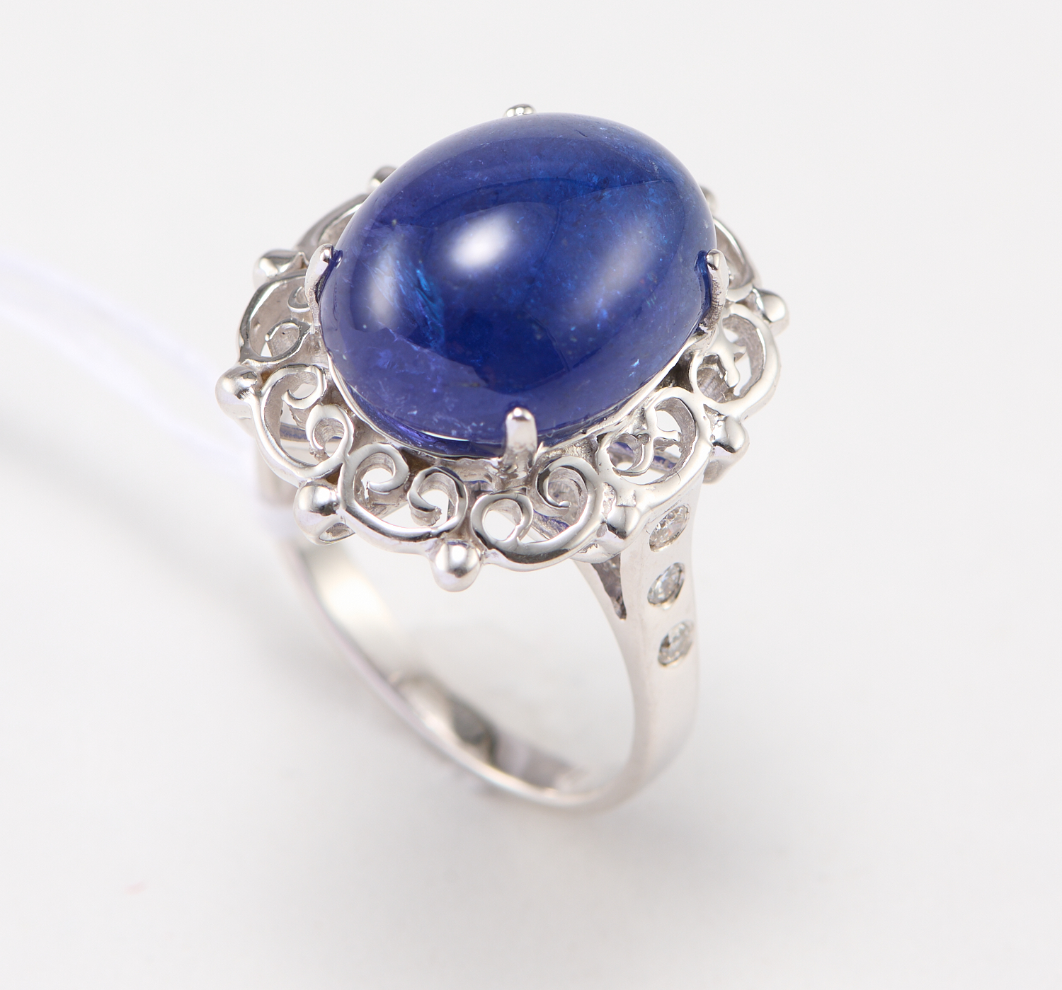 A CABOCHON TANZANITE RING IN 18CT WHITE GOLD, THE TANZANITE TOTALLING 12.05CTS, RING SIZE M, WEIGHT 8.51GMS