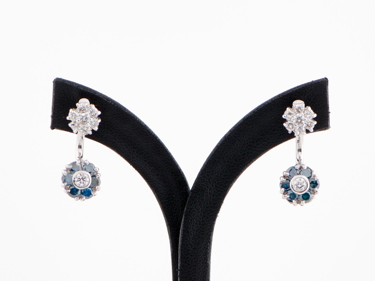A PAIR OF DETACHABLE DIAMOND AND BLUE DIAMOND EARRINGS IN 18CT WHITE GOLD, TO POST AND BUTTERFLY FITTINGS, TOTAL DIAMOND WEIGHT 1.85CTS, 6.175GMS