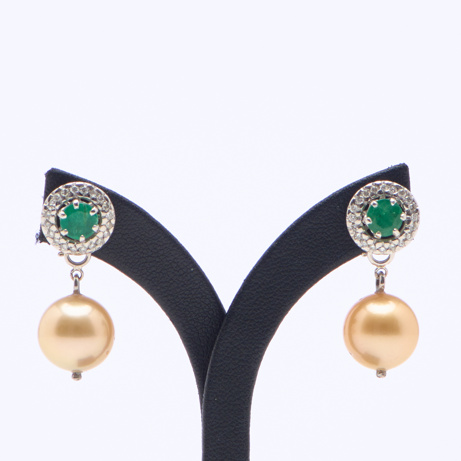A PAIR SOUTH SEA PEARL, EMERALD AND DIAMOND DETACHABLE EARRINGS IN 18CT WHITE GOLD, TO POST AND BUTTERFLY FITTINGS, THE PEARLS MEASURING 12.2MM, THE EMERALDS TOTALLING 1.34CTS, THE DIAMONDS TOTALLING 0.38CTS, LENGTH 30MM, WEIGHT 9.72GMS