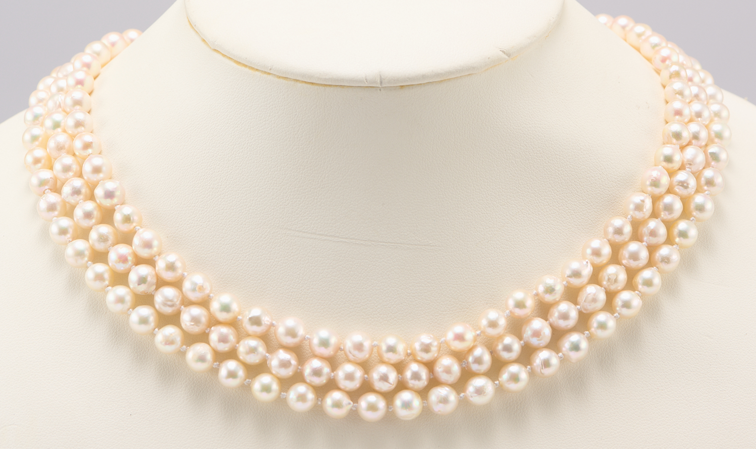 A TRIPLE STRAND OF CULTURED PEARLS TO A GOLD PLATED SILVER CLASP, THE PEARL DIAMETER APPROXIMATELY 6MM, NECKLACE LENGTH 450MM