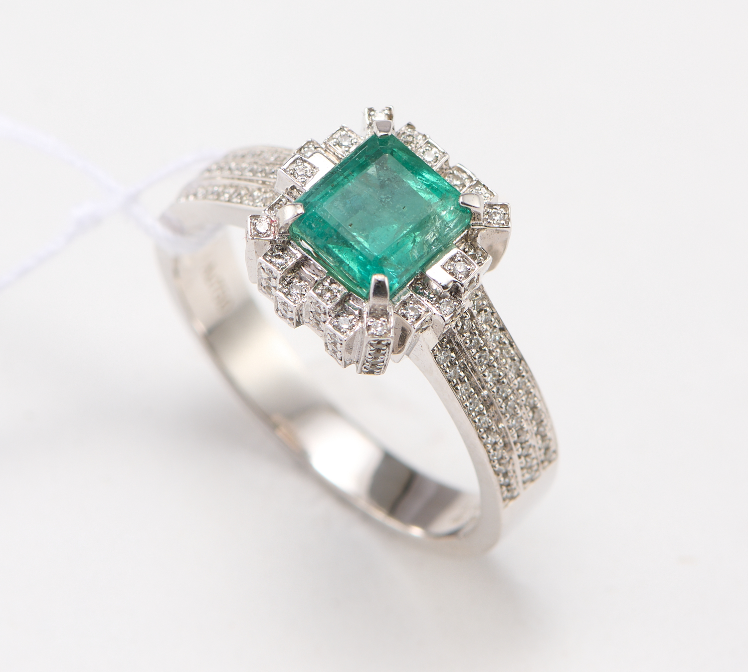 AN EMERALD AND DIAMOND SET RING IN 18CT WHITE GOLD, THE EMERALD MEASURING APPROXIMATELY 1.5CTS, THE DIAMONDS TOTALLING 0.39CTS, RING SIZE S