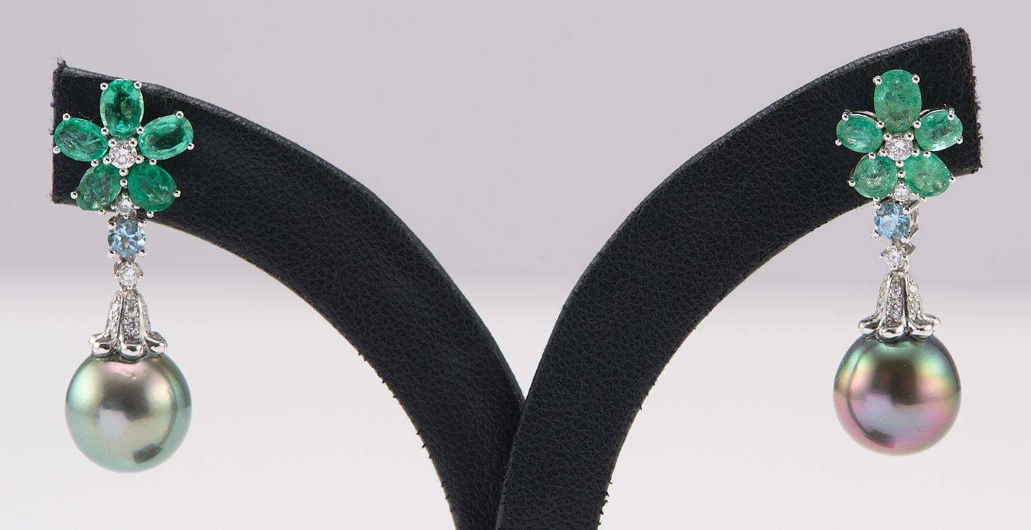 A PAIR OF EMERALD, DIAMOND AND PEARL EARRINGS IN 18CT WHITE GOLD TO POST AND BUTTERFLY FITTINGS, THE EMERALDS TOTALLING 2.3CTS, THE DIAMONDS TOTALLING 0.528CTS, THE PEARL DIAMETER MEASURING 10MM, LENGTH 35MM