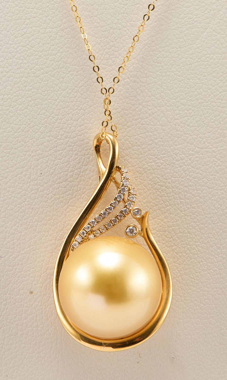 A GOLDEN SOUTH SEA PEARL AND DIAMOND SET PENDANT TO FINE CHAIN IN 18CT GOLD, THE PEARL DIAMETER 15MM, THE DIAMONDS TOTALLING 0.12CTS