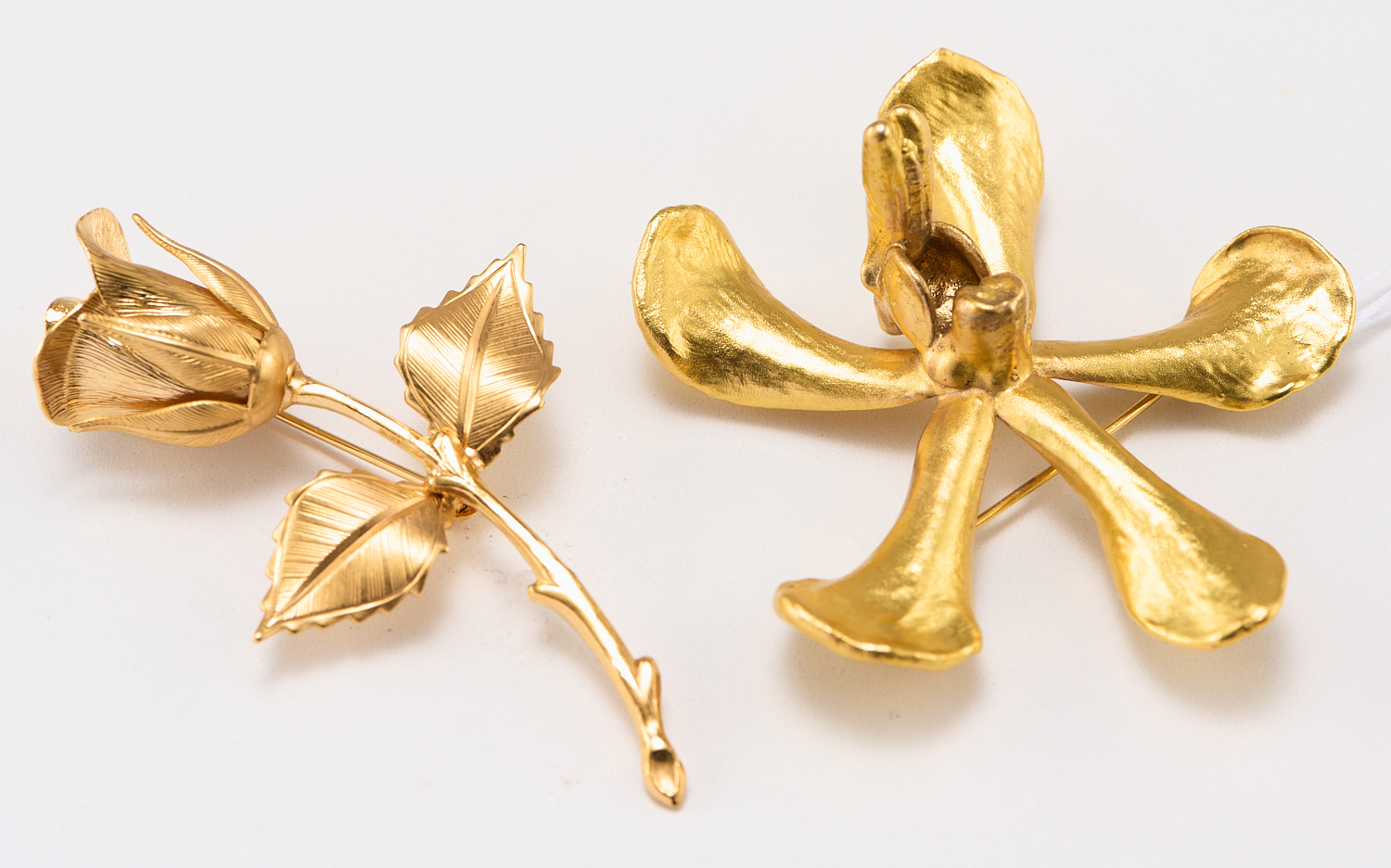 TWO FLOWER BROOCHES IN GOLD PLATE, THE ORCHID (REAL, GOLD PLATED, BOXED) 60MM X 60MM, THE ROSE 70MM X 45 (AT WIDEST)