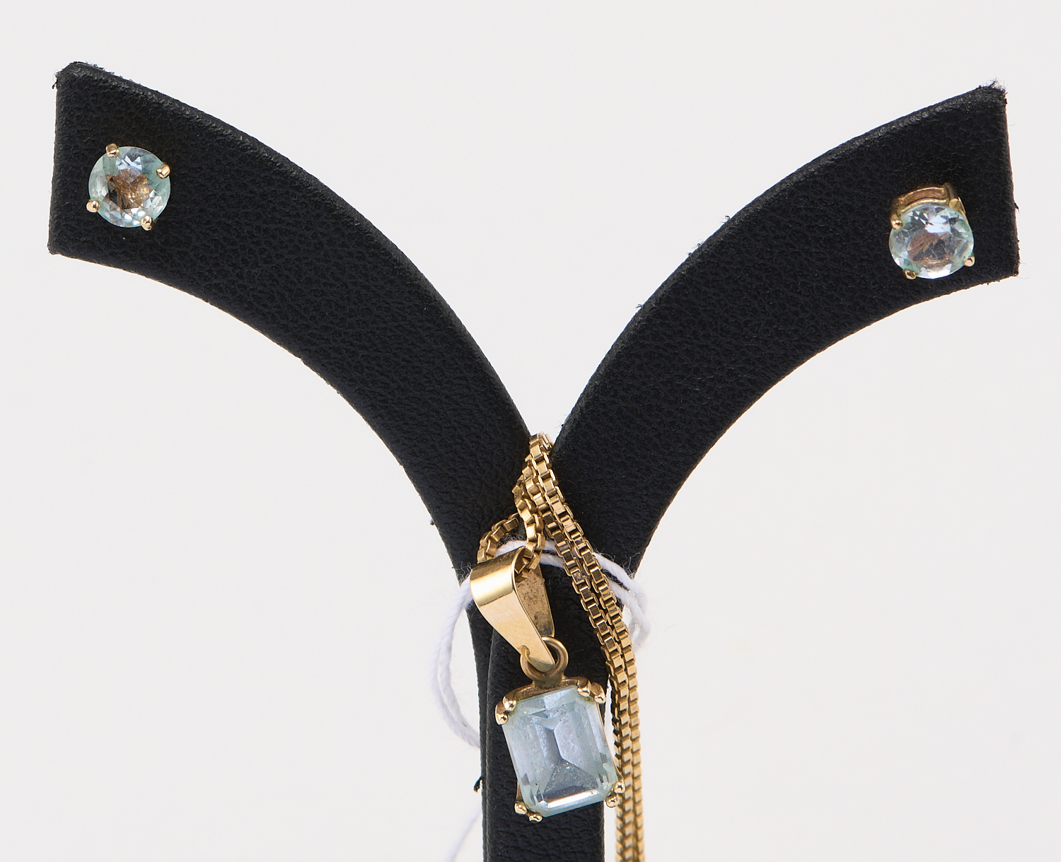 AN AQUAMARINE PENDANT AND STUD EARRINGS IN 9CT GOLD, THE EARRINGS TO POST AND BUTTERFLY FITTINGS, 4.195GMS