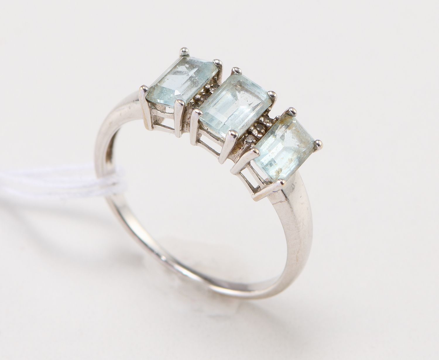 AN AQUAMARINE AND DIAMOND RING IN 9CT WHITE GOLD, RING SIZE Q, 2.410GMS