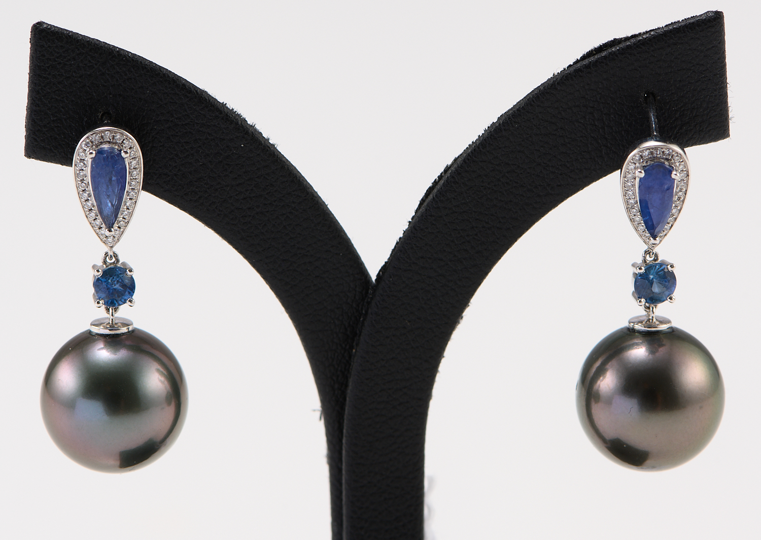 A PAIR OF SAPPHIRE AND DIAMOND SET TAHITIAN PEARL EARRINGS IN 18CT WHITE GOLD, THE SAPPHIRE TOTALLING 1.54CTS, THE DIAMONDS TOTALLING 0.144CTS, THE PEARL MEASURING 13MM, LENGTH 25MM