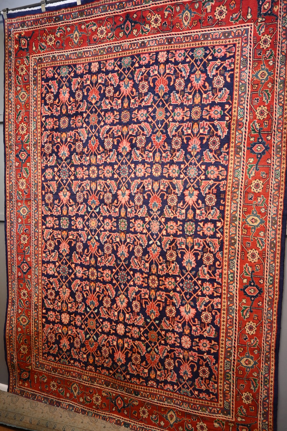 A COLOURFUL AND BEAUTIFUL PERSIAN MESHKABAD RUG. 100% WOOL- HIGH DENSE PILE. STURDY & HARD-WEARING. VILLAGE WEAVE FROM THE HAMADAN REGION WITH TRADITIONAL DESIGN OF ALL-OVER LARGE HERATI MAHI & FLORAL PATTERNS IN TONES OF ROSE, COGNAC & BRUNSWICK GREEN ON A NAVY FIELD. BORDER OF PALMETTES & ROSE MOTIFS. IN SUPERB CONDITION- EX GALLERY PIECE. SIZE: 320 X 214 CM ORIGIN: PERSIA - RRP: $3,800 DOCUMENTATION OF AUTHENTICITY INCLUDED.