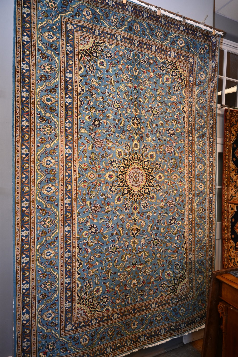 AN EXCEPTIONAL EXAMPLE OF A PERSIAN ROYAL KASHMAR CARPET. 100%FINE WOOL & WEAVE. SUNBURST CENTRAL MEDALLION IN GOLD & FRENCH BLUE TONES ON A UNIQUE TURQUOISE ALL OVER TONE OF PALMETTOS, SCROLLS AND LEAF FORMS. WITH ALL OVER TONES OF COGNAC, CREAM FRENCH BLUE, GOLD AND GREEN COLOURS. EX GALLERY STOCK. SIZE: 300 X 196 CM - RRP: $7,500 DOCUMENTATION OF AUTHENTICITY INCLUDED.