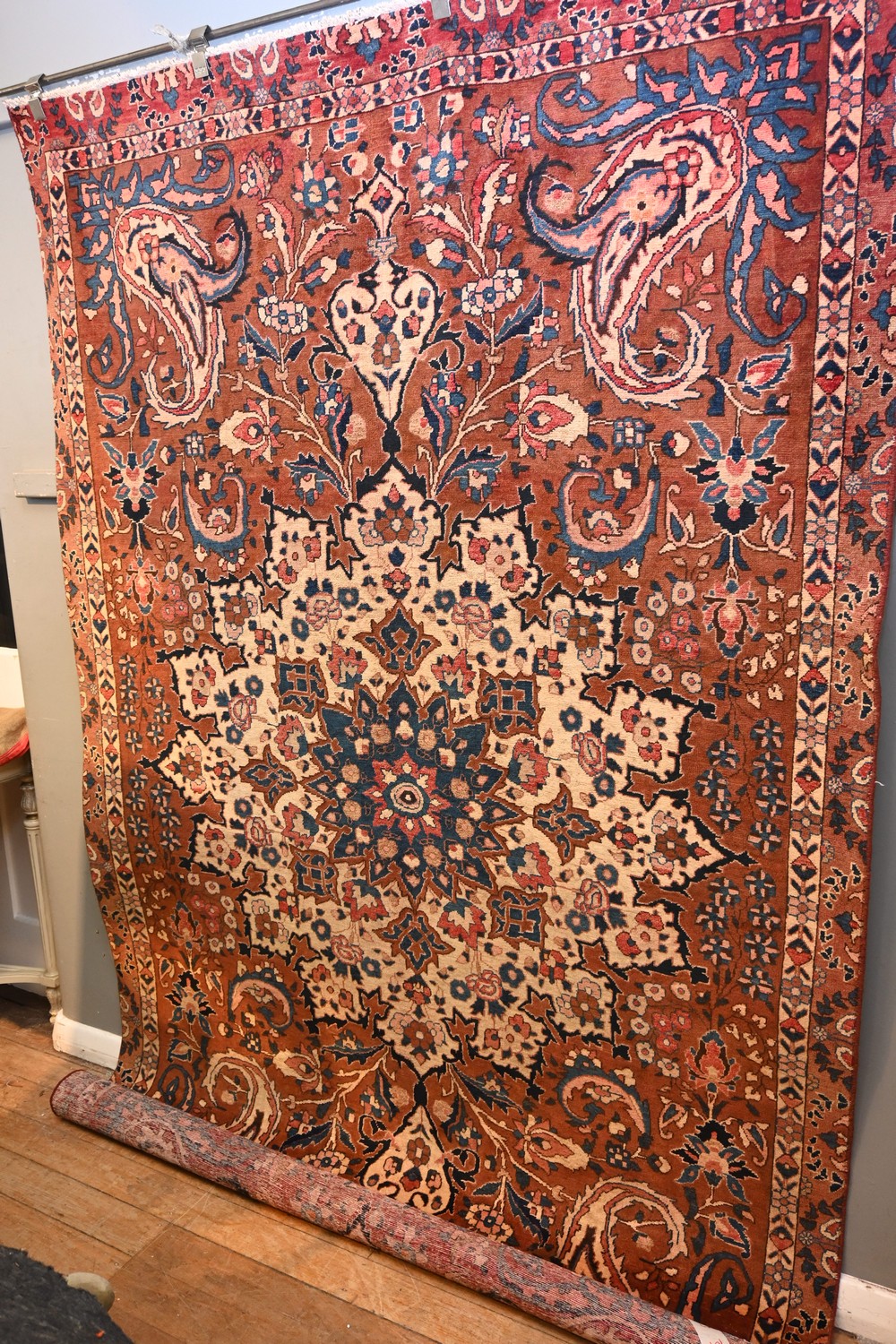 A PERSIAN BAKHTIAR SAMAN RUG CIRCA 1960'S, 100% WOOL. HAND KNOTTED TRIBAL BAKHTIARI WEAVE AND DESIGN OF BOLD ANCHORED FLORAL MEDALLION AND QUARTERED CORNER MEDALLIONS OF PAISLEY DESIGN IN A SUBTLE RED FIELD OF FLORAL MOTIFS AND TENDRILS IN ROSE, CREAM AND FRENCH BLUE. BORDER OF PALMETTES AND TENDRILS. A TRULY MAGNIFICENT RUG. RESTORED TO GALLERY CONDITION. SIZE: 290 X 185 CM ORIGIN PERSIA- RRP: $5,600 DOCUMENTATION OF AUTHENTICITY INCLUDED.