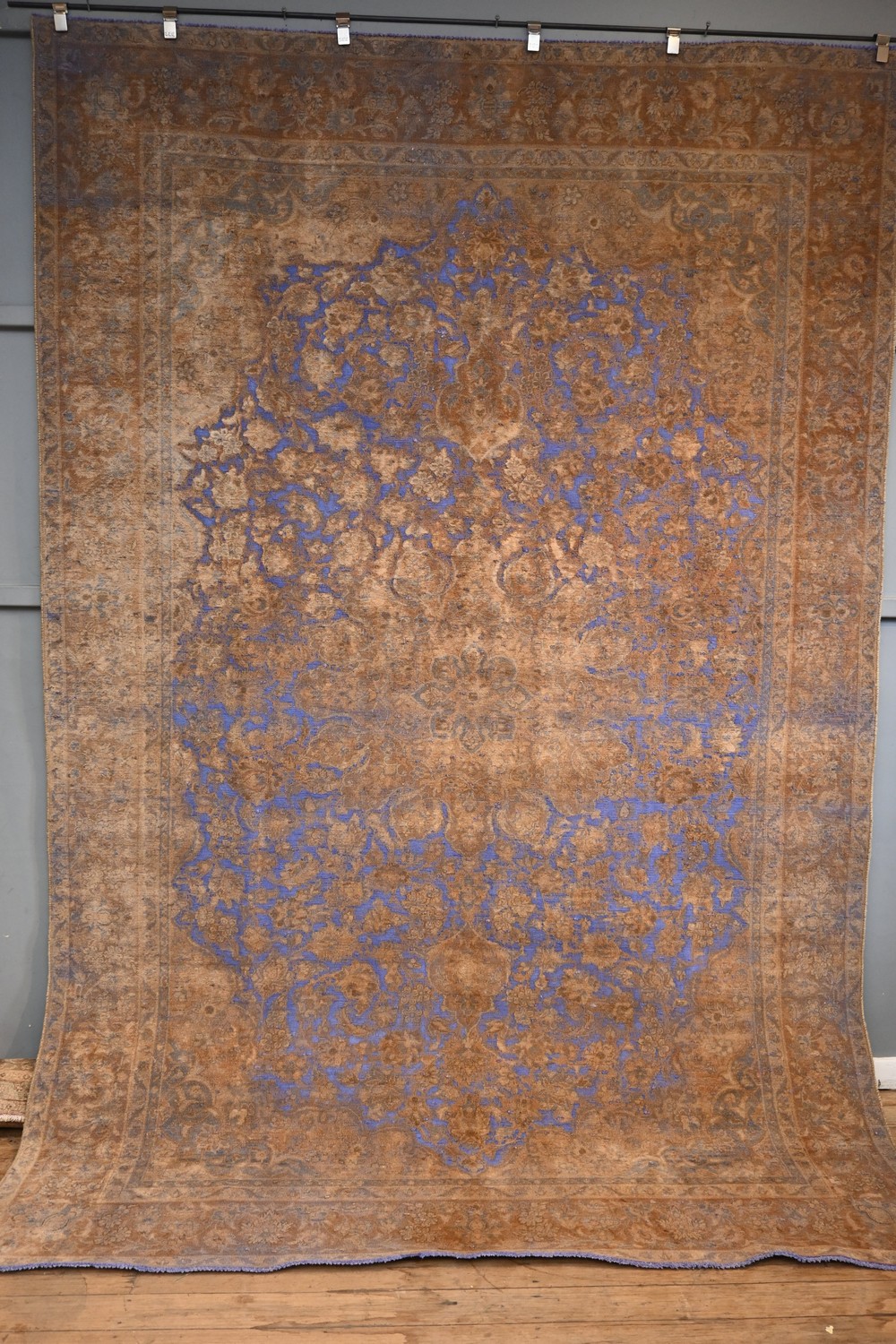 A CONTEMPORARY VINTAGE OVER-DYED PERSIAN TABRIZ CARPET. A UNIQUE MODERN CARPET CREATED FROM AN AUTHENTIC TABRIZ CARPET WITH A DISTINCTIVE MEDALLION. THE PILE LIGHTLY SHORN AND OVER-DYED IN A BEAUTIFUL GOLD, TAN & LILAC TONES. SIZE: 375 X 250 CM ORIGIN: IRAN - RRP: $6,900 DOCUMENTATION OF AUTHENTICITY INCLUDED.