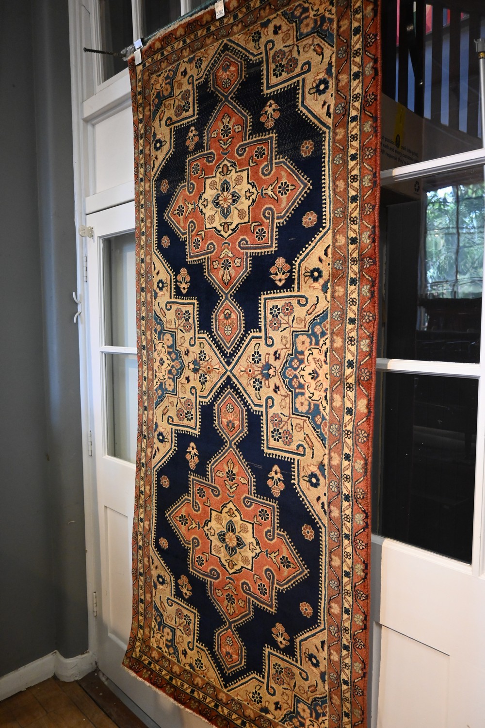 A PERSIAN JOZAN RUG, 100% WOOL. HAND-KNOTTED JOZAN WEAVE WITH A CLASSIC DESIGN OF DOUBLE ANCHORED MEDALLIONS IN RED AND CHARCOAL ON A GOLD FIELD OF BLOSSOMING FLORAL SPRAYS AND QUARTERED CORNER MEDALLIONS. BORDER OF ROSETTES & TRIBAL MOTIFS. SIZE: 225 X 100 CM ORIGIN: PERSIA - RRP: $2,400 DOCUMENTATION OF AUTHENTICITY INCLUDED.
