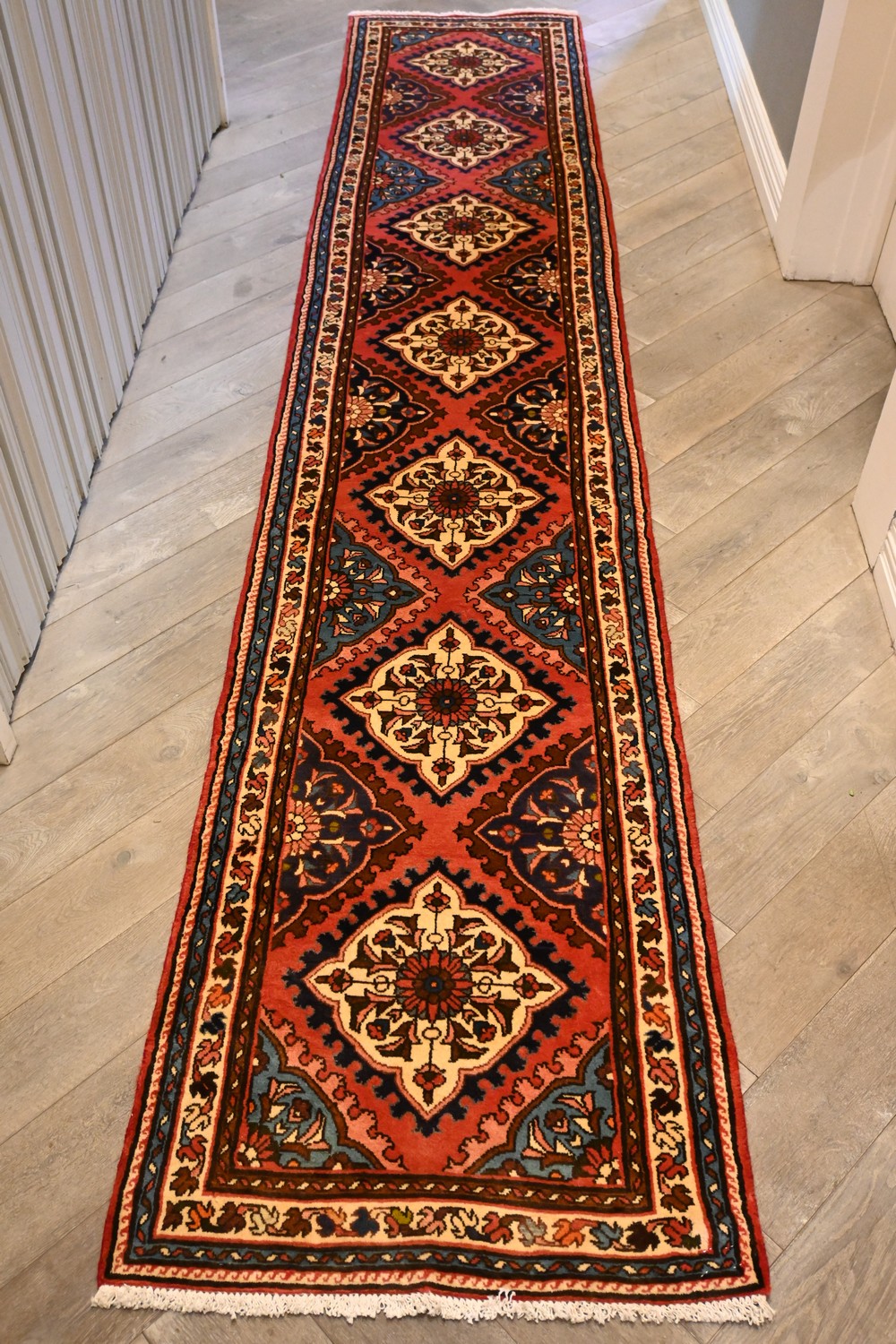 A STUNNING PERSIAN DARJEZINE HALL RUNNER, IN PRISTINE CONDITION. SUPERBLY AND FINELY HAND KNOTTED WITH FINEST WOOL- SOLID LUSH PILE COMPRISING OF LINKED ALL OVER DIAMOND MOTIF DESIGN WITH A COMBINATION OF CORAL, CREAM AND FRENCH BLUE TONES. SIZE: 397 X 80 CM ORIGIN: IRAN - RRP: $2,900 DOCUMENTATION OF AUTHENTICITY INCLUDED
