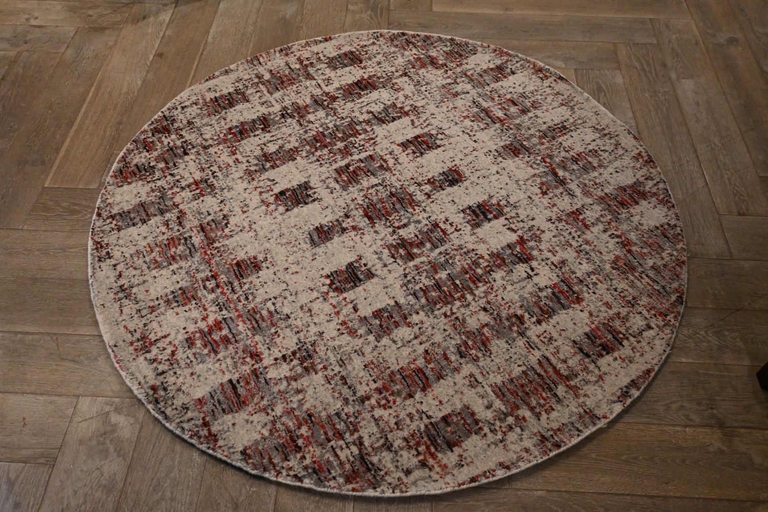 A BRAND-NEW MODERN DESIGNER ROUND RUG. HANDLOOMED. WOOL AND SILKY TEXTURE. IN TONES OF GREY, RED AND BROWN SIZE: 152 X 152 CM - ORIGIN: INDIA RRP: $1,400