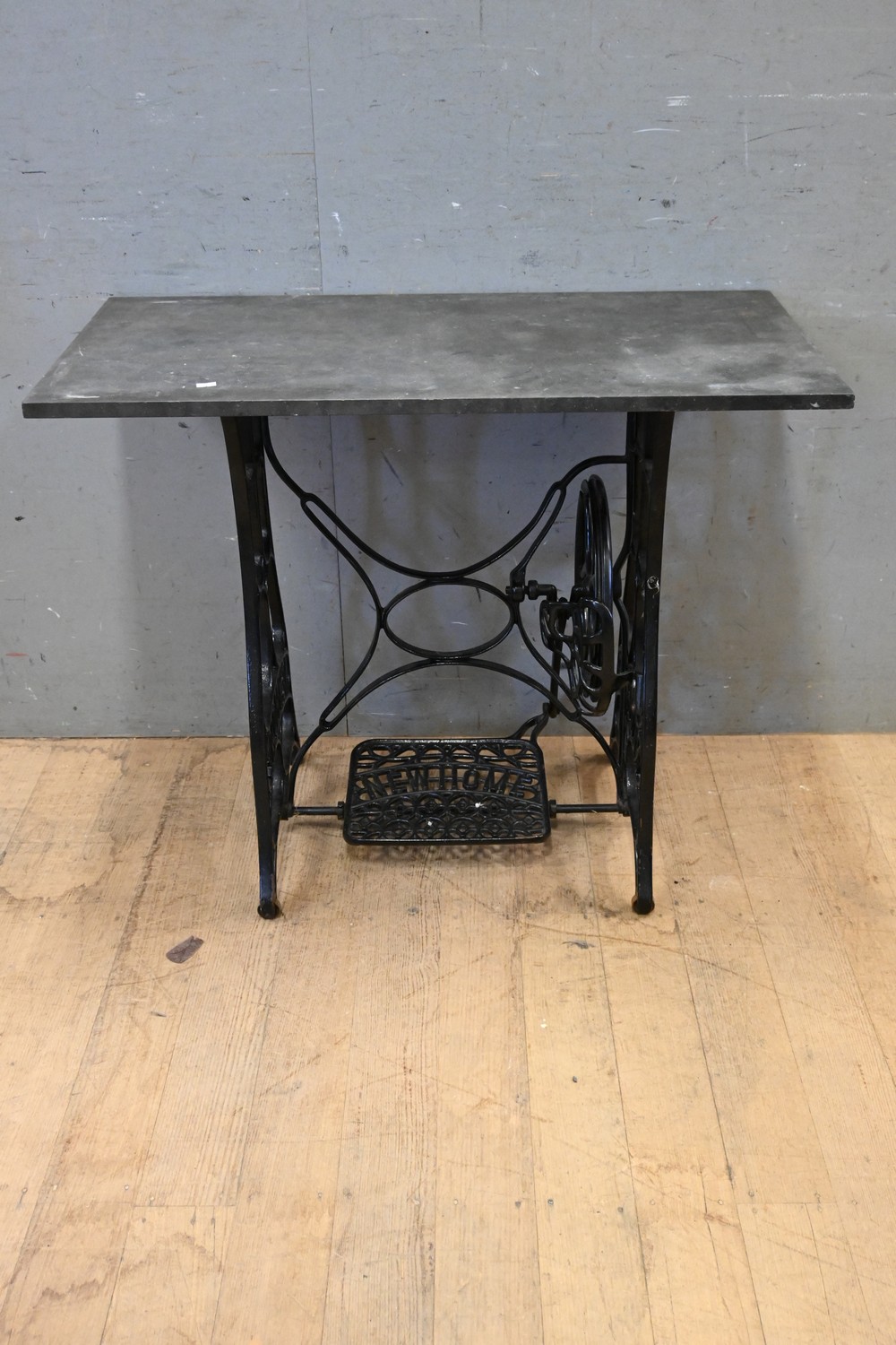 A GRANITE TOP GARDEN TABLE WITH SEWING MACHINE BASE (A/F) (74H X 92W X 46D CM) (PLEASE NOTE THIS HEAVY ITEM MUST BE REMOVED BY CARRIERS AT THE CUSTOMER'S EXPENSE. LEONARD JOEL STAFF CANNOT ASSIST CARRYING THIS ITEM) (X-LARGE ITEM)