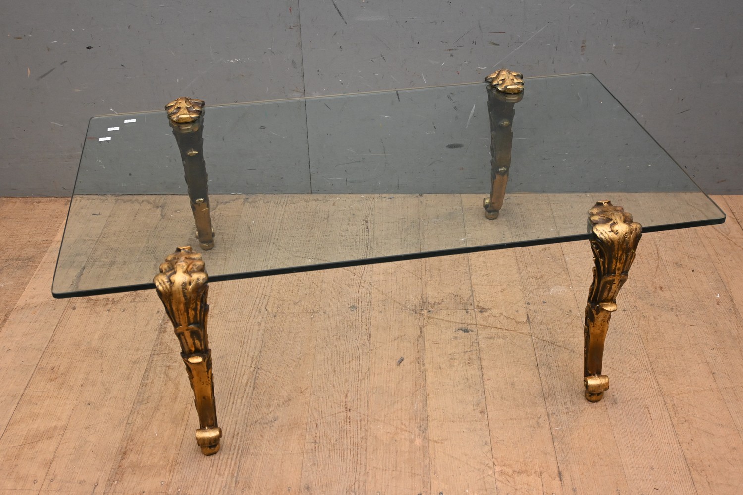 A GLASS TABLE WITH DECORATIVE GILT EFFECT LEGS (A/F) (39H X 107W X 66D CM) (LEONARD JOEL DELIVERY SIZE: X-LARGE)