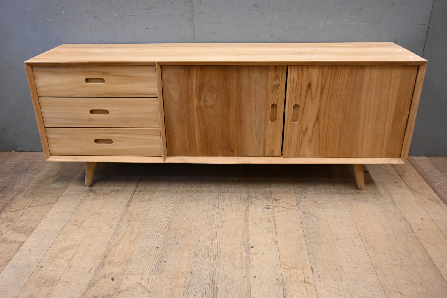 A MID CENTURY STYLE TEAK SIDEBOARD (61H X 160W X 40D CM) (PLEASE NOTE THIS HEAVY ITEM MUST BE REMOVED BY CARRIERS AT THE CUSTOMER'S EXPENSE. LEONARD JOEL STAFF CANNOT ASSIST CARRYING THIS ITEM) (X-LARGE ITEM)