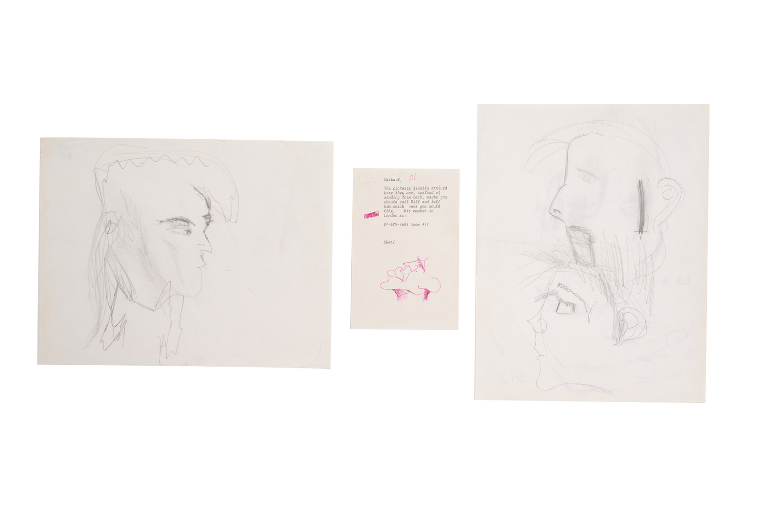 three pencil on paper and one red ballpoint drawn on a note from a friend. All unsigned. circa. late 1980s / early 90s