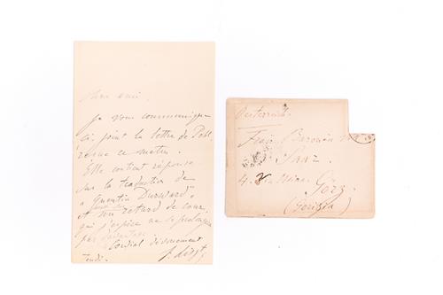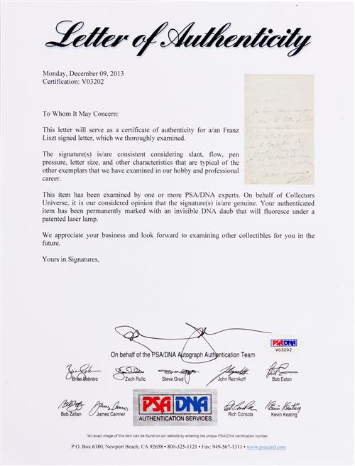 in French to a friend a German music critic. Signed "F. Liszt". Accompanied with a photograph of the composer & pianist and certificate of authenticity from PSA/DNA.