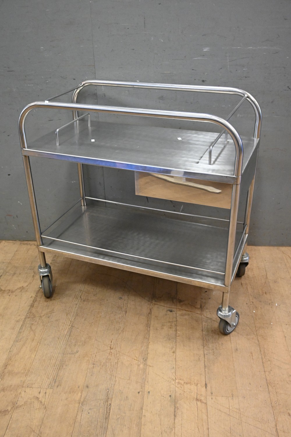 A SOLID STAINLESS STEEL TWO TIER HOSPITAL TROLLEY WITH DRAWER TO ONE END AND WITH ORIGINAL WHEELS (88H X 85W X 45D CM) (LEONARD JOEL DELIVERY SIZE: X-LARGE)
