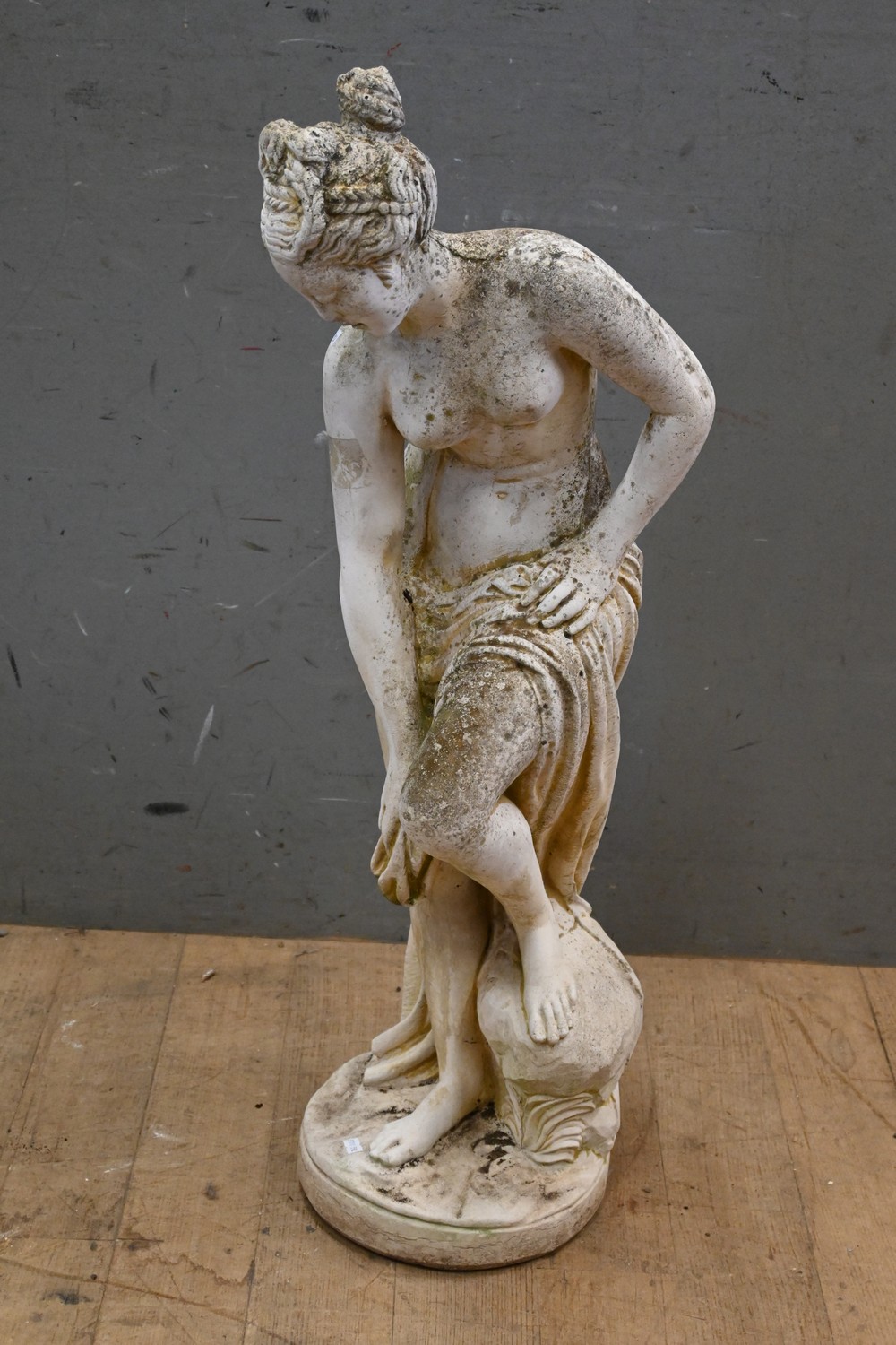 A FRENCH RECONSTITUTED STONE NAKED MAIDEN LADY GARDEN FIGURE (90H CM) (PLEASE NOTE THIS HEAVY ITEM MUST BE REMOVED BY CARRIERS AT THE CUSTOMER'S EXPENSE. LEONARD JOEL STAFF CANNOT ASSIST CARRYING THIS ITEM) (X-LARGE ITEM)