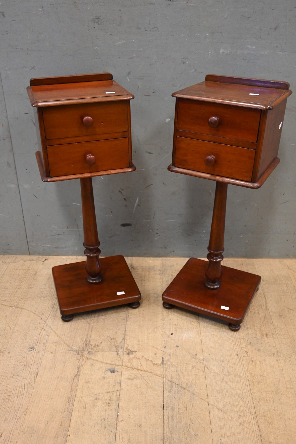 A PAIR OF 19TH CENTURY AUSTRALIAN CEDAR TWO DRAWER PEDESTAL BASED SIDE TABLES (A/F) (65H X 25W X 25D CM) (LEONARD JOEL DELIVERY SIZE: MEDIUM)