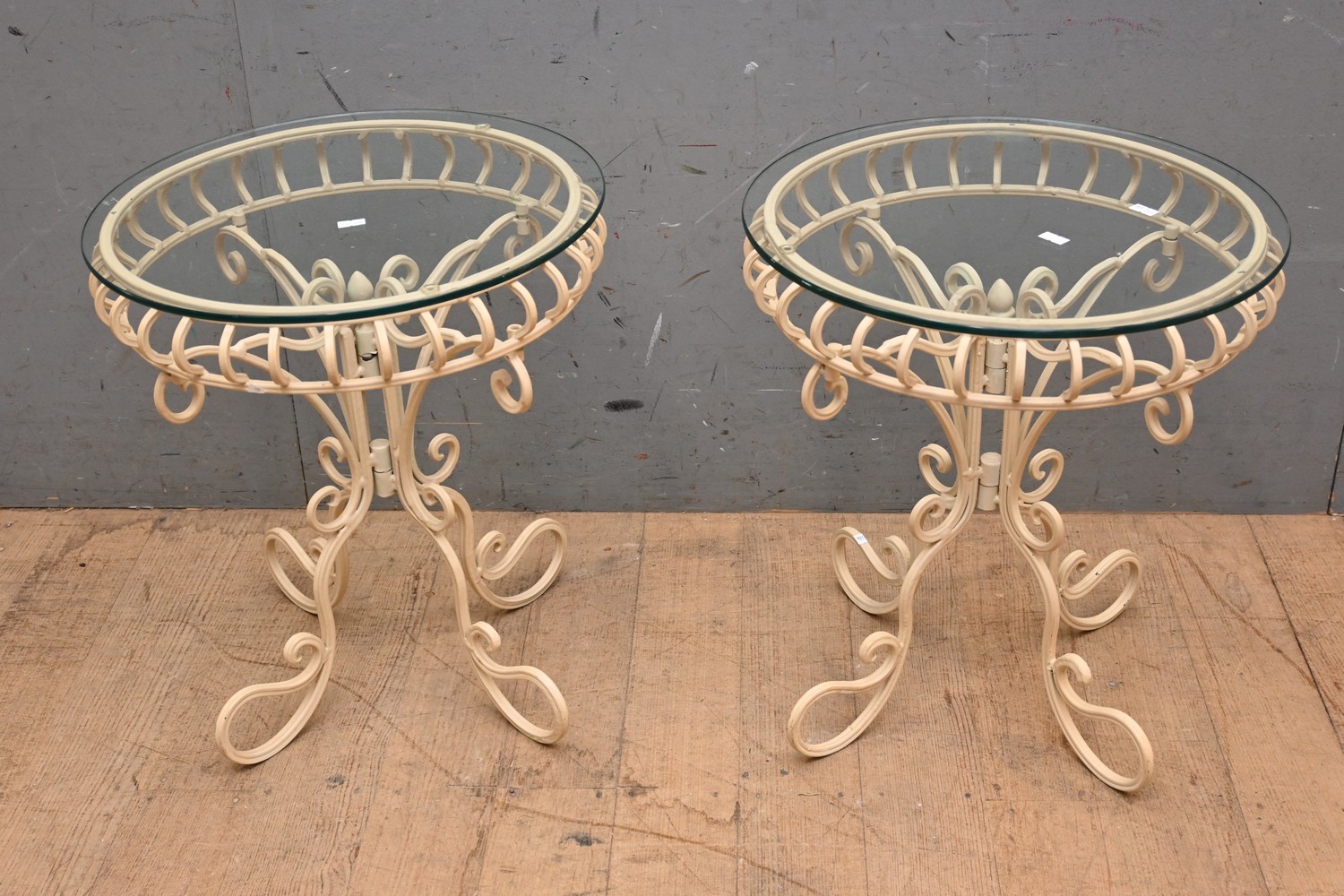 A PAIR OF CREAM COLOURED CAST-IRON FOLDING BASED CIRCULAR TOPPED GLASS TOPPED SIDE TABLES (48H X 43D CM) (LEONARD JOEL DELIVERY SIZE: MEDIUM)