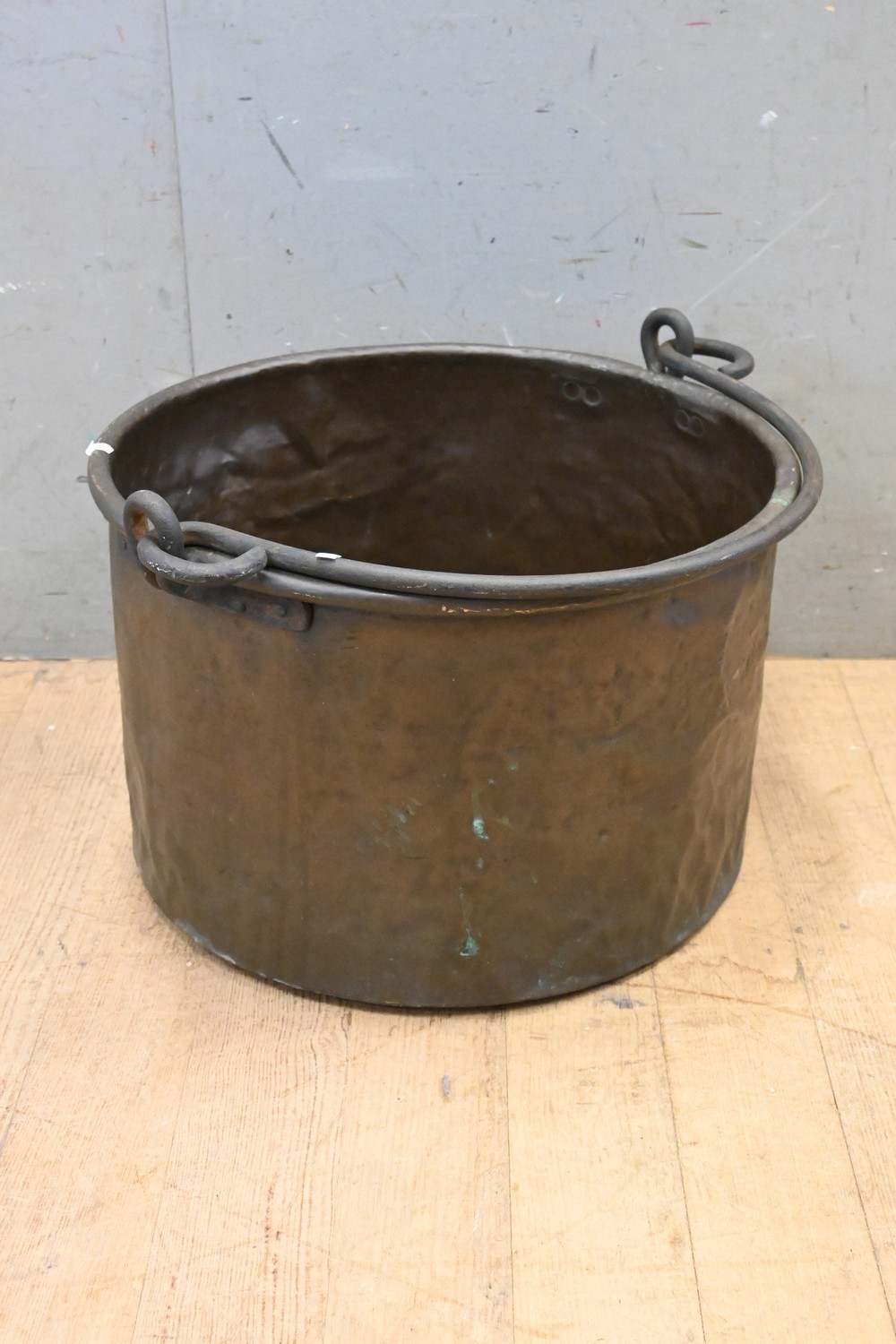 A FRENCH COPPER CAULDRON POT WITH ORIGINAL WROUGHT IRON SWING HANDLE (35H X 62W CM) (LEONARD JOEL DELIVERY SIZE: LARGE)