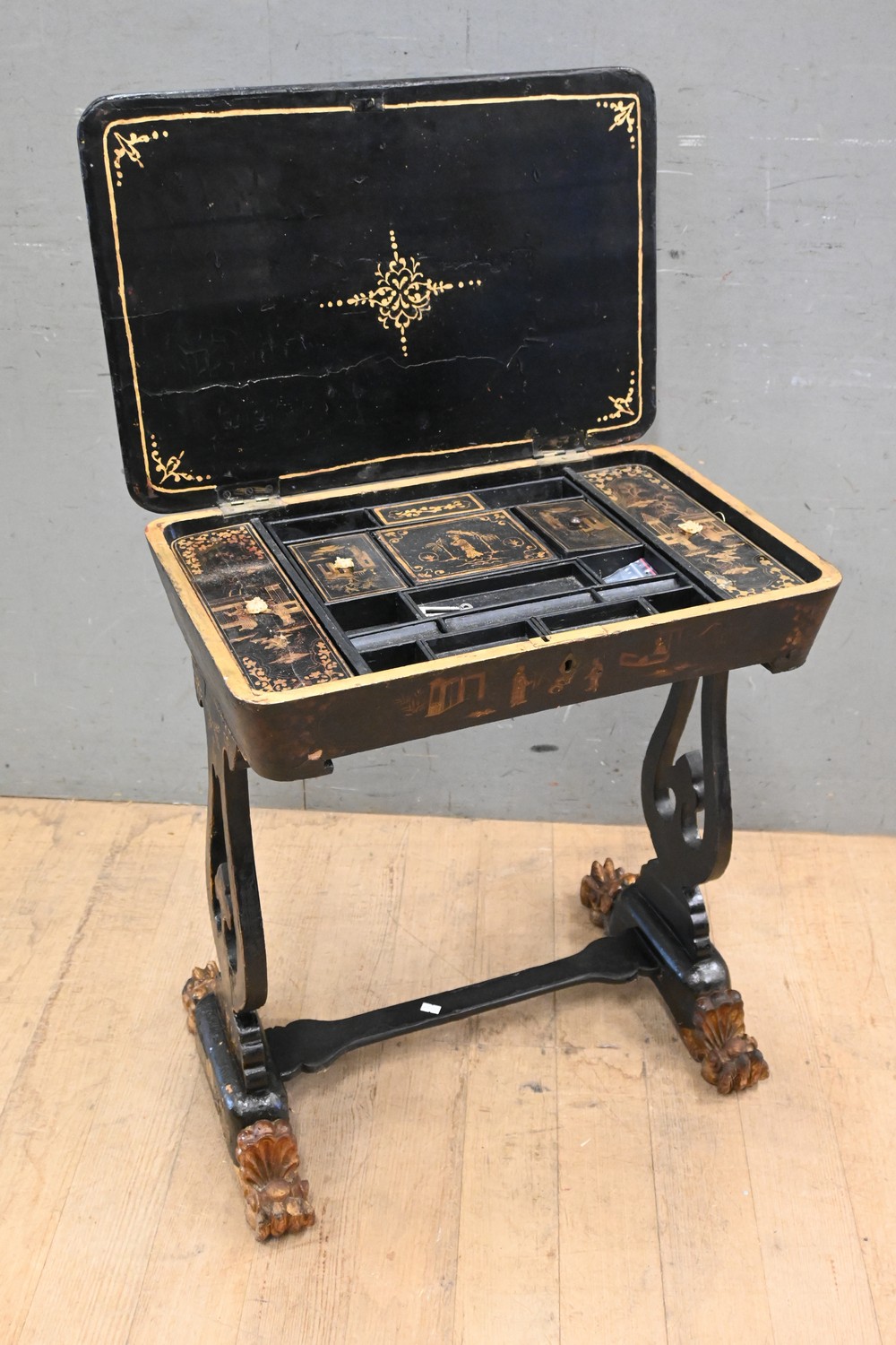 A CHINOISERIE BLACK LACQUERED LIFT TOP SEWING/GAMES TABLE WITH GILT DECORATION AND LION PAW FEET (A/F) (70H X 61W X 41D CM) (LEONARD JOEL DELIVERY SIZE: LARGE)