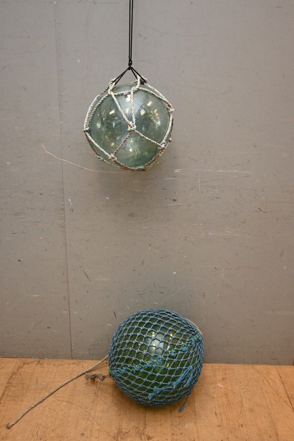 TWO GREEN GLASS AND ROPE BOUND LARGE FISHING FLOATS/SHIP BUOYS (42D CM) (LEONARD JOEL DELIVERY SIZE: LARGE)