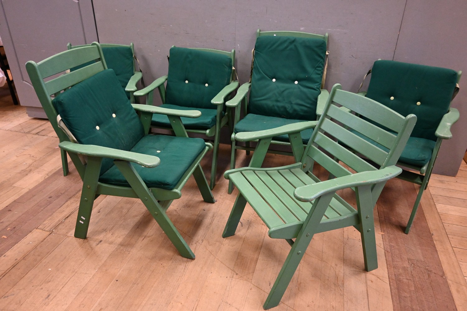 A SET OF SIX AUSTRALIAN MADE GREEN SLATTED TEAK ARMCHAIRS (A/F) (98H X 63W X 65D CM) (PLEASE NOTE THIS HEAVY ITEM MUST BE REMOVED BY CARRIERS AT THE CUSTOMER'S EXPENSE. LEONARD JOEL STAFF CANNOT ASSIST CARRYING THIS ITEM) (X-LARGE ITEM)