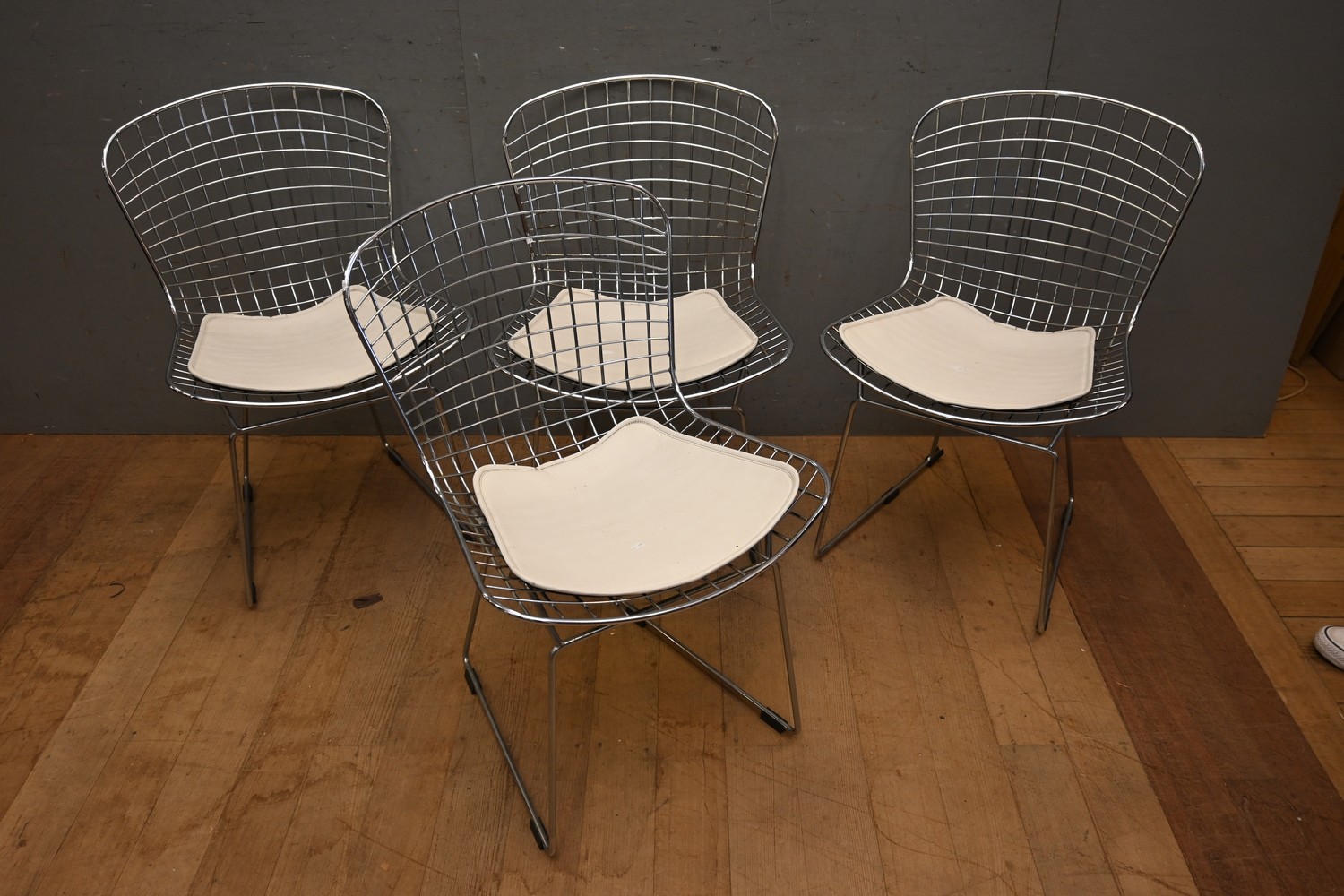 A SET OF FOUR WIRE FORM BERTOIA STYLE CHROMED STEEL DINING CHAIRS (A/F) (80H X 52W X 54D CM) (LEONARD JOEL DELIVERY SIZE: LARGE)
