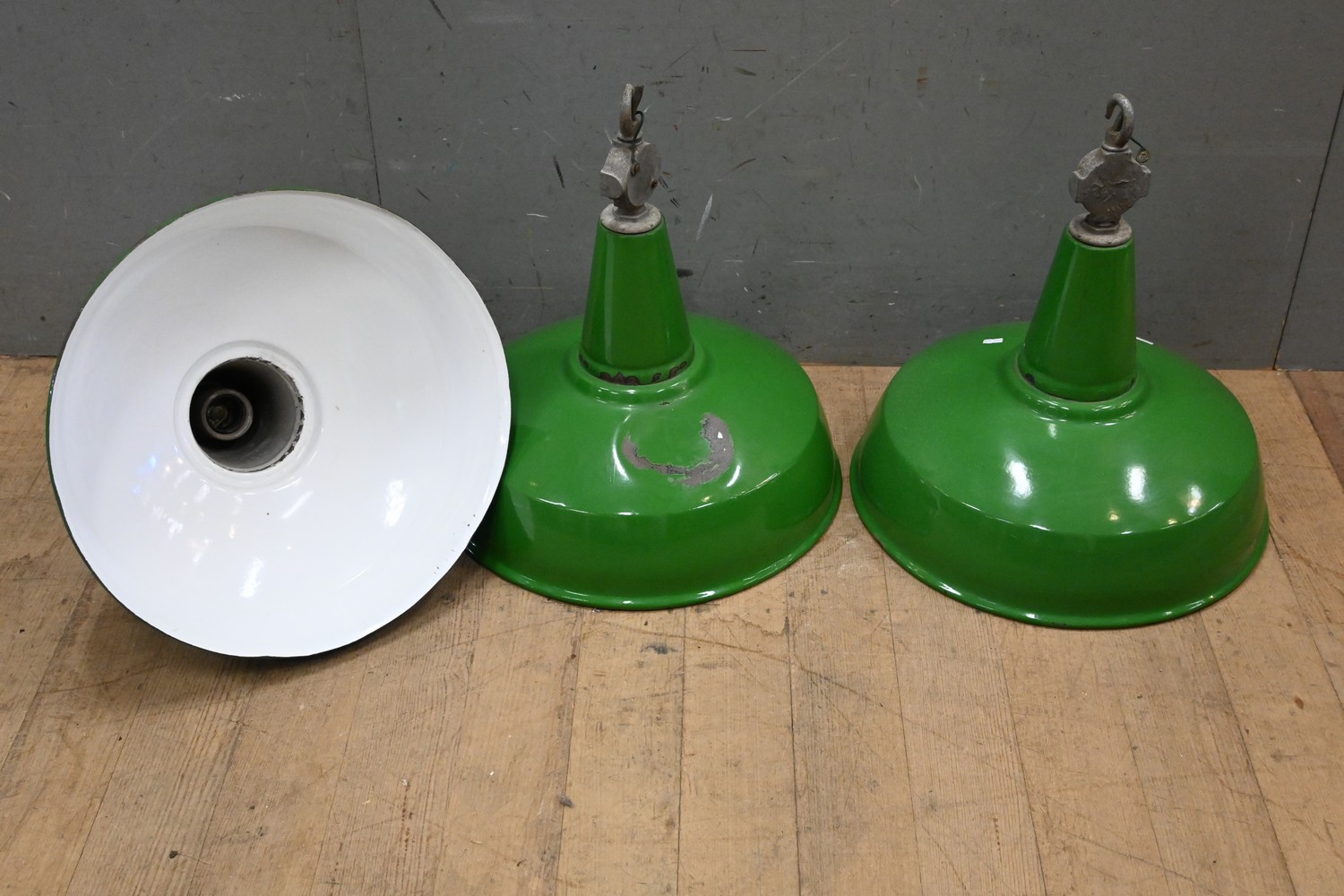 A GROUP OF THREE INDUSTRIAL ENAMELLED STEEL GREEN HANGING FACTORY LIGHTS (A/F) ( 48H X 49 DIAMETER CM) (LEONARD JOEL DELIVERY SIZE: MEDIUM)
