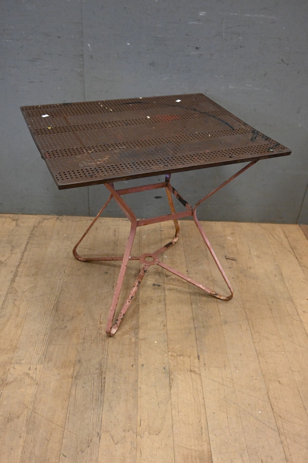 A STEEL BASED METAL TOPPED RECTANGULAR FORM OUTDOOR GARDEN PATIO TABLE (A/F) (67H X 76H X 61D CM) (LEONARD JOEL DELIVERY SIZE: LARGE)