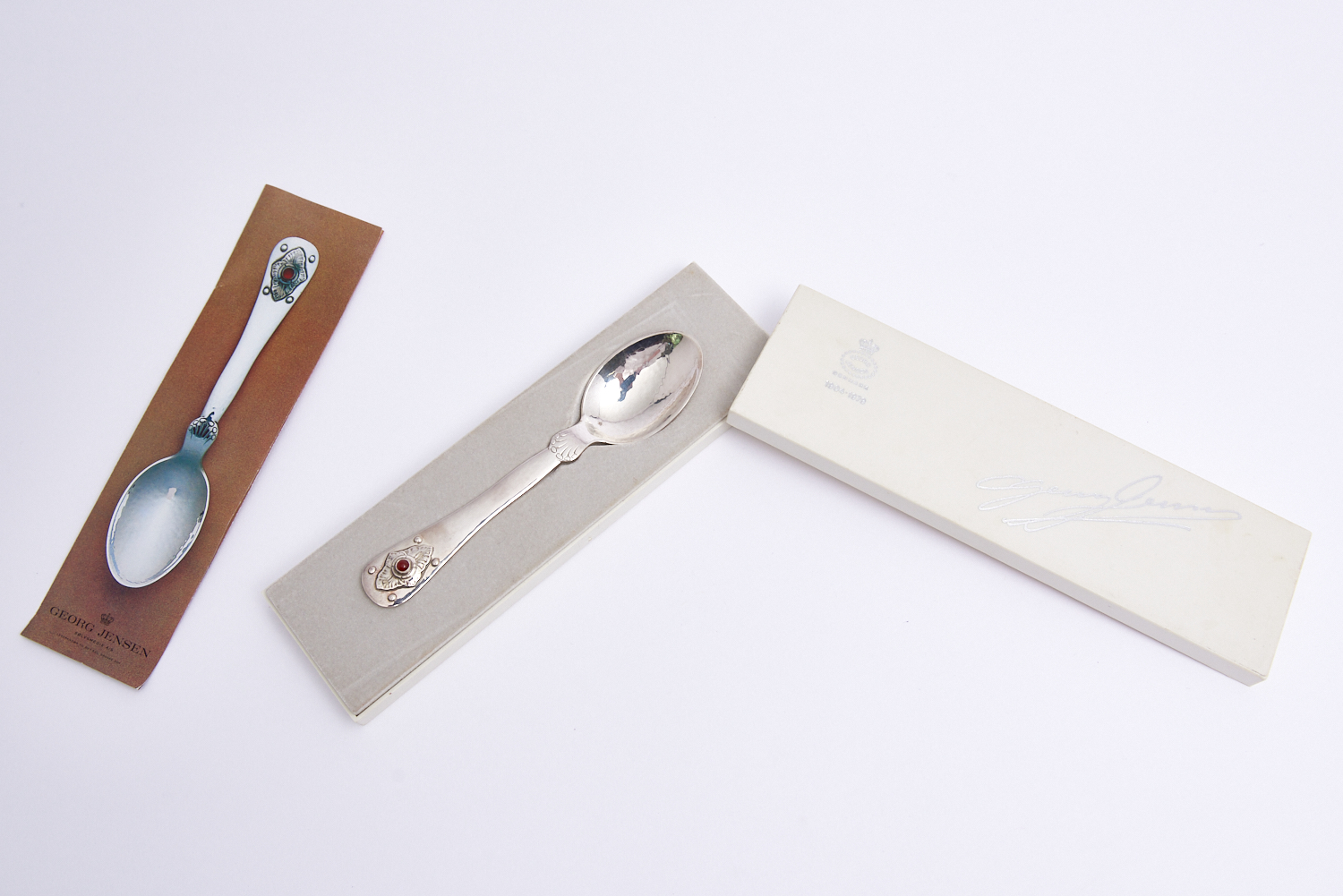 A STERLING SILVER GEORG JENSEN 75 YEARS ANNIVERSARY SPOON WITH CARNELIAN INSET, BOXED, LEONARD JOEL LOCAL DELIVERY: SMALL