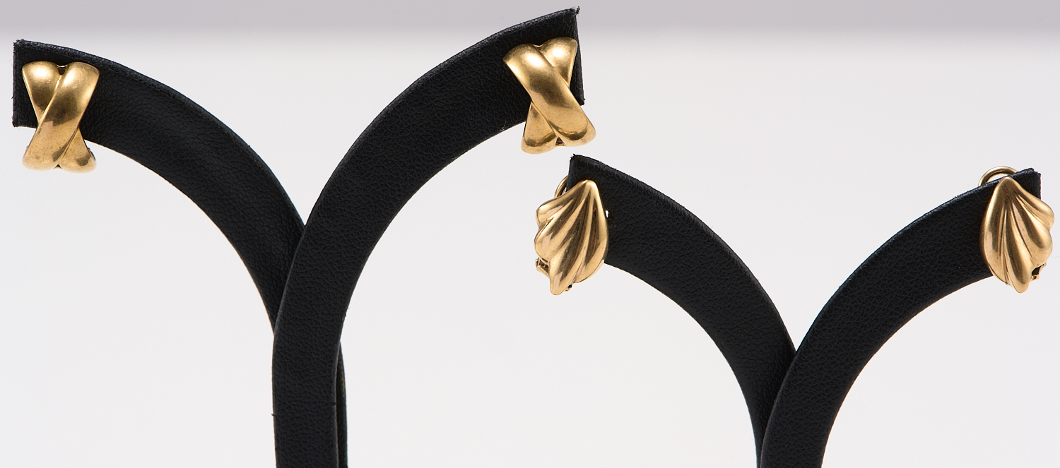 TWO PAIR OF EARRINGS TO CLIP ON FITTINGS IN 9CT GOLD, LENGTH APPROXIMATELY 13.22 AND 13.90MM, 6.1GMS
