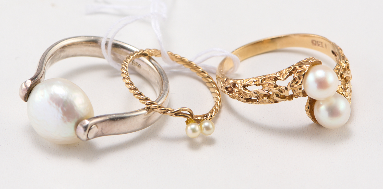 THREE PEARL RINGS, TWO IN 9CT GOLD (4.7GMS) AND ONE SILVER, RING SIZES U, Q AND L