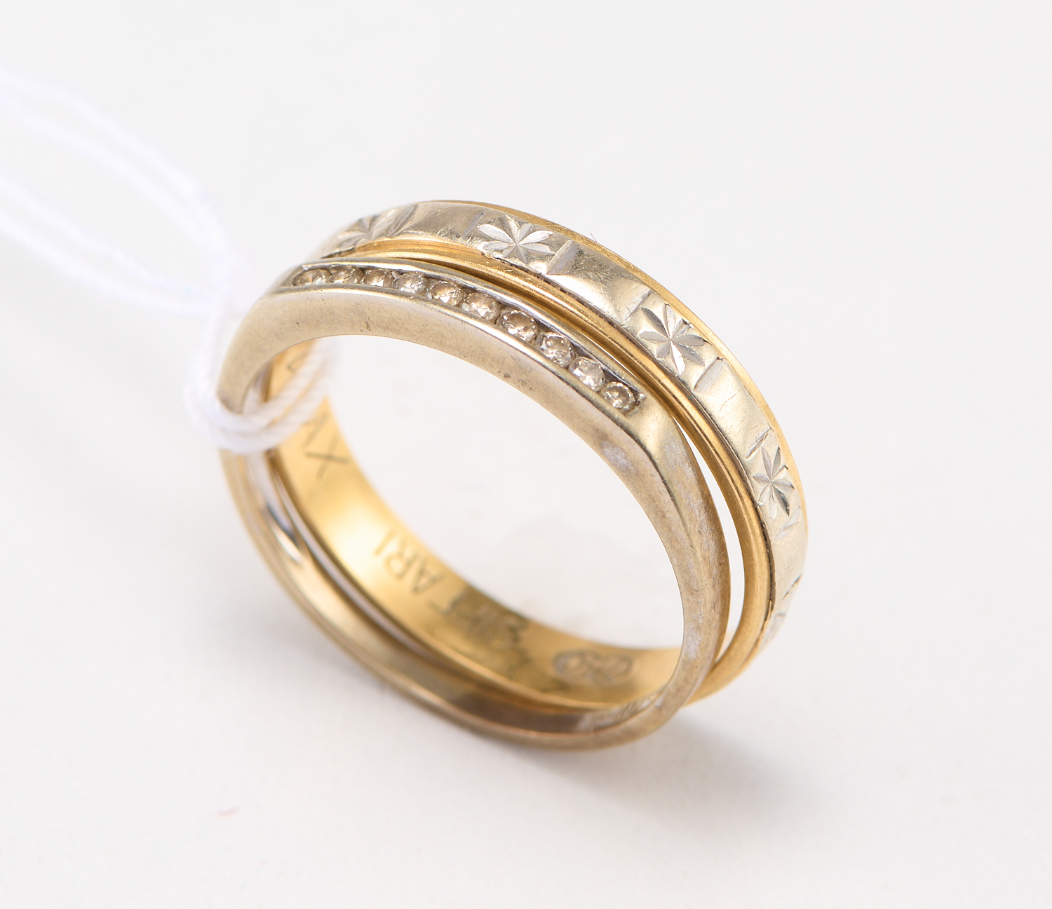 A DIAMOND SET RING IN 9CT WHITE GOLD (1.1GMS, SIZE M-N), AND A RING IN 18CT TWO TONE GOLD (2.4GMS, SIZE P)