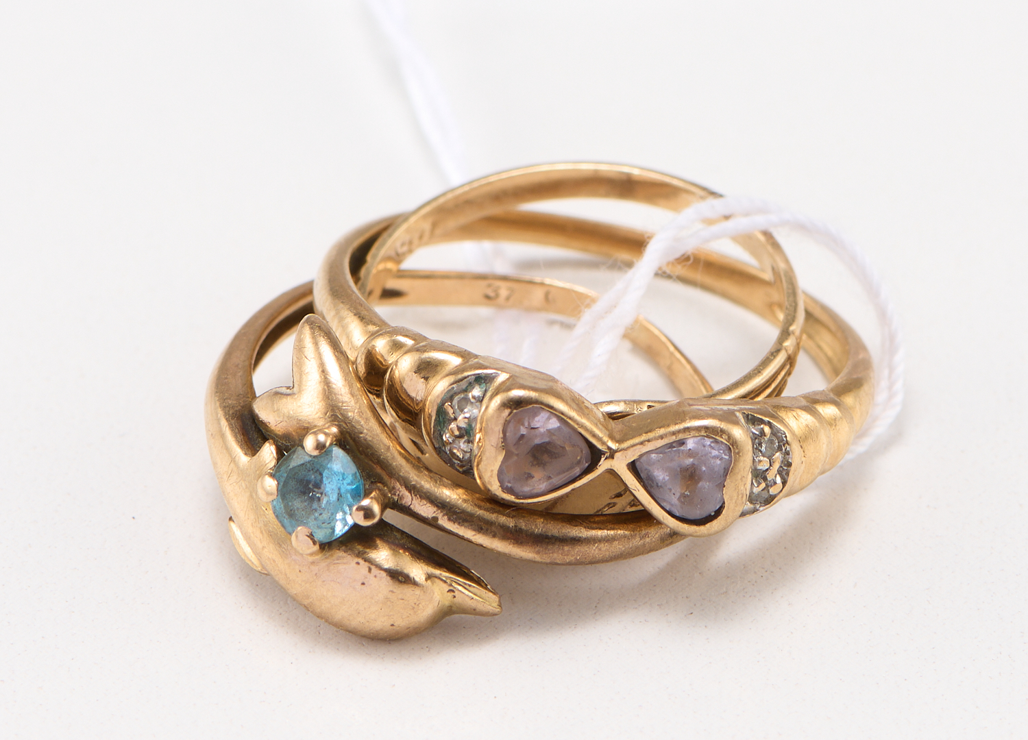 THREE GEM-SET AND PASTE SET RINGS IN 9CT GOLD, RINGS SIZES O, J AND I, 4.58GMS