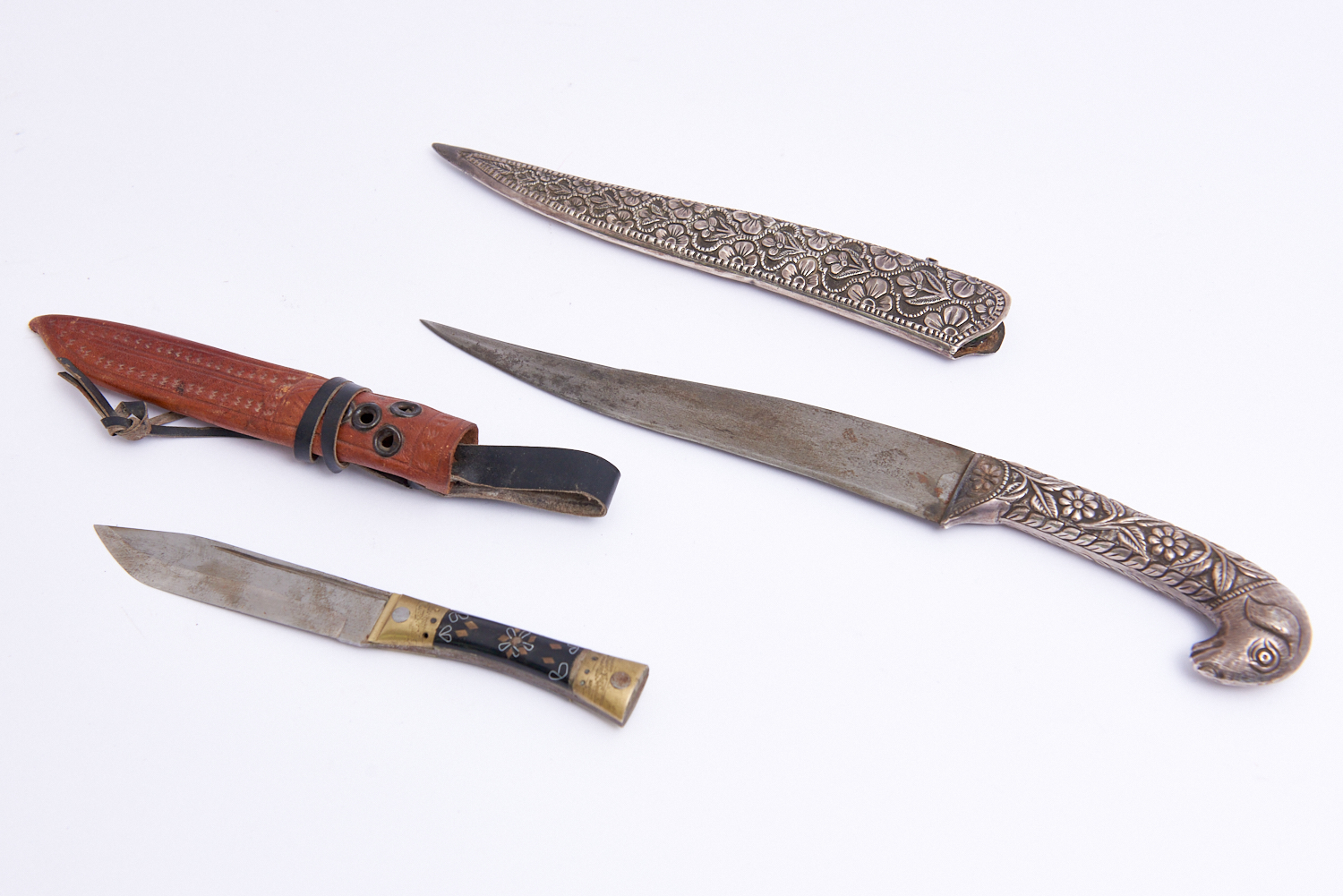 TWO KNIVES, ONE SILVER WITH RAMS HEAD, THE OTHER EASTERN STYLE L.28CM, LEONARD JOEL LOCAL DELIVERY: SMALL