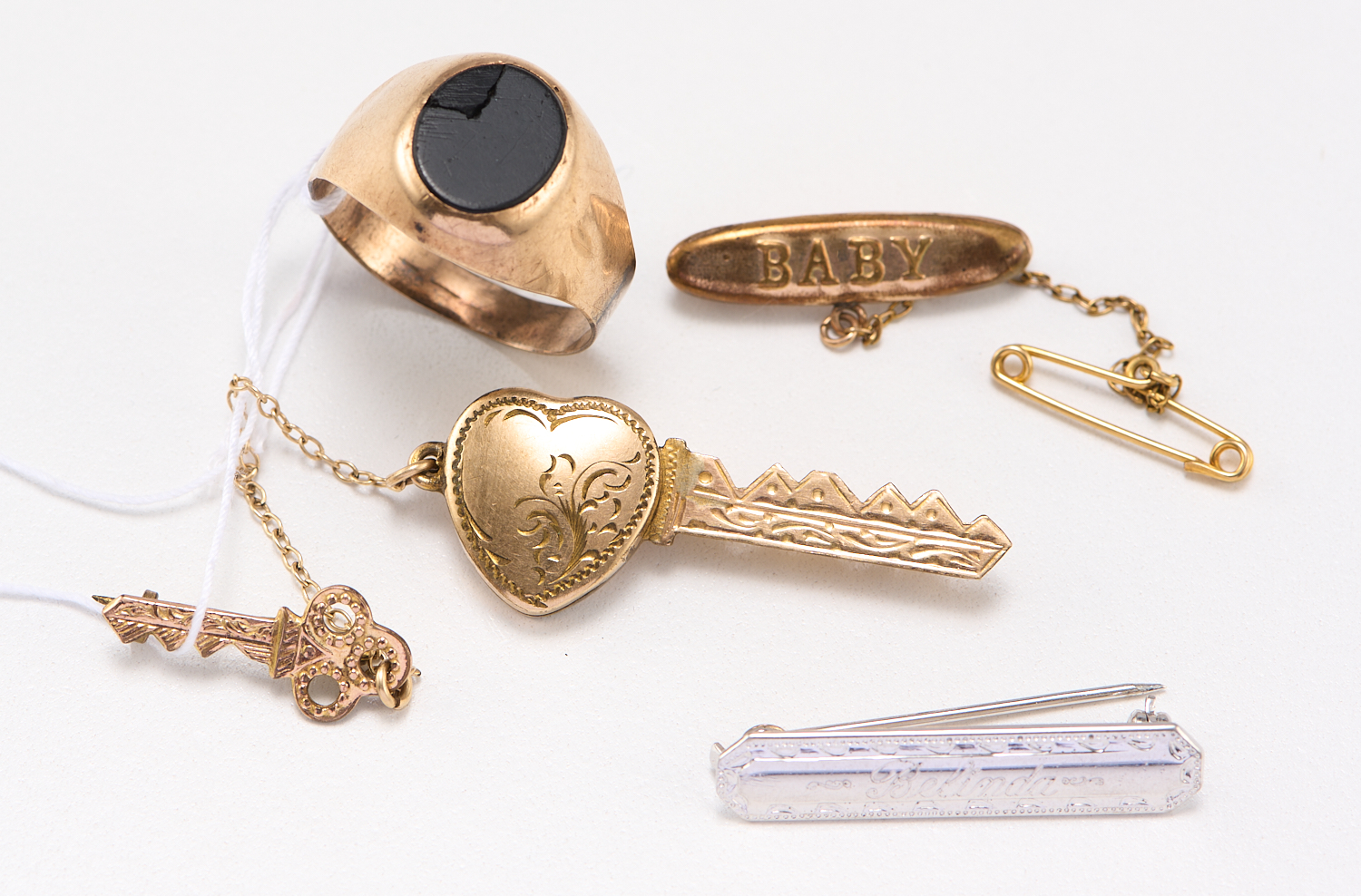 A/F CRACK TO ONYX AND SOME WEAR TO METAL OF RING, GOLD FRONTED BROOCH STAMPED 'BABY', SILVER BROOCH ENGRAVED 'BELINDA'