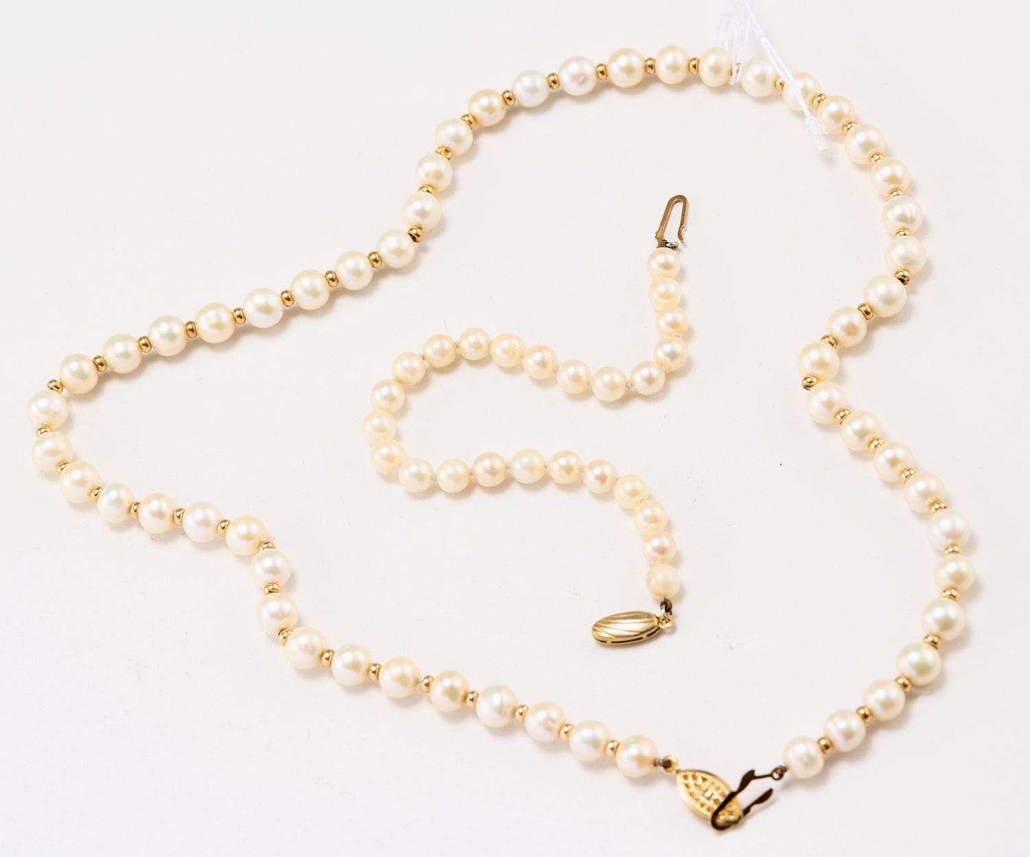 A PEARL NECKLACE AND BRACELET IN TO CLASPS IN GOLD PLATED SILVER, THE NECKLACE APPOXIMATELY 500MM, THE BRACELET APPOXIMATELY 180MM