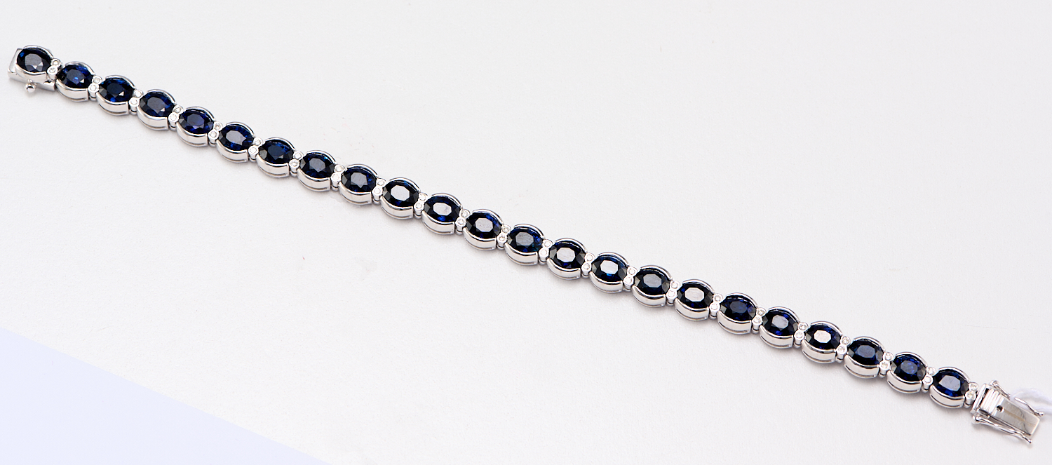 AN 18CT WHITE GOLD, SAPPHIRE AND DIAMOND BRACELET SET WITH A ROW OF TWENTY-THREE SAPPHIRES TOGETHER WEIGHING APPROXIMATELY 17.50 CARATS BETWEEN BRILLIANT-CUT DIAMOND PAIRS, LENGTH APPROXIAMATELY 180MM.